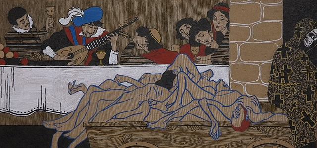 На улице стоит накрытый стол, за которым пируют несколько молодых мужчин и женщин. Один из пирующих, молодой человек, обращаясь к председателю пира, напоминает об их общем друге, весёлом Джексоне, чьи шутки и остроты забавляли всех, оживляли застолье и разгоняли мрак, который теперь насылает на город свирепая чума. Джексон мёртв, его кресло за столом пусто, и молодой человек предлагает выпить в его память. Председатель соглашается, но считает, что выпить надо в молчании, и все молча выпивают в память о Джексоне.